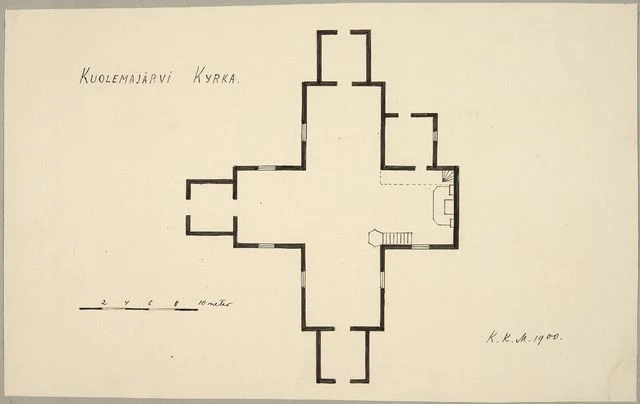 | Josef Stenbäckin ottama valokuva Kuolemajärven vanhasta kirkosta ja kellotapulista 1895 -1900. Kuva Museoviraston kuvakokoelmasta. |